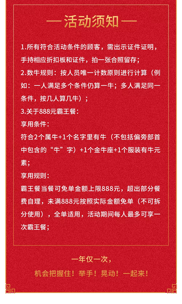 比如,无论是顾客名字中有牛,还是属牛,或者星座是金牛座、服装配饰上有牛元素,到店都可享受折扣,而且达到2牛享8.8折、3牛享7.7折、4牛享6.6折,5牛便可获得888元霸王餐!